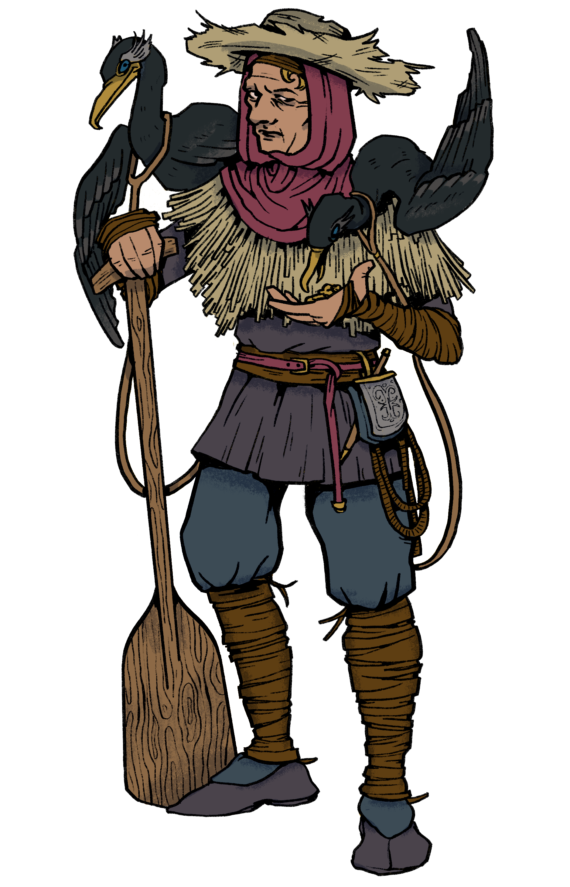 Given that “farmland creation” is the goal of the duke NPC, it follows that the fen should be broadly unfarmable to begin with. This tracks, as fens are usually not conducive to traditional agriculture. As we wanted to give the village a distinctly “shitty English countryside” feel, we decided eels would be an appropriately unique staple food for the villagers. The fen has creeks, and thus eel fishing seemed reasonable. But how do the villagers get the eels? One of our team members brought up the concept of cormorant fishing, a technique whereby fishermen train cormorants to catch fish for them. This was a perfect stylistic fit for the setting. We invented a cormorant-esque bird called the “moorwing” and made them a key feature of the setting. Moorwings prompted us to add an aviary to the setting and instantly spawned the unique NPC archetype of “moorwing eeler.”