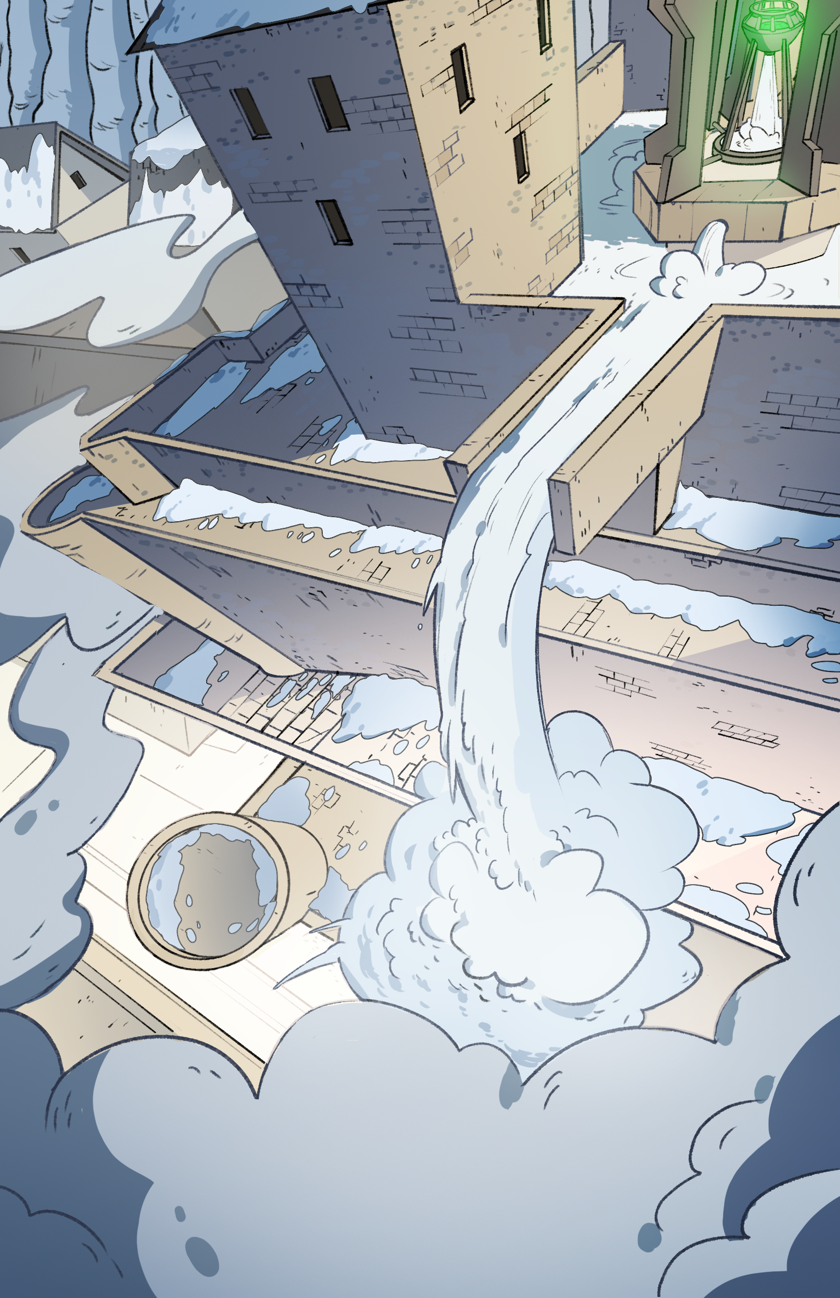 Now I’ve got a simple piece of lore that I can build upon. If alchemists used to live here, what sort of alchemical stuff is in the fortress? Most of alchemy is about transmuting one type of matter into another, so what if they had a means of creating fresh drinking water? That’s how we came up with the torrent opus, a device that perpetually deposits freshwater into a vast cistern under the fortress. In addition to being a cool bit of worldbuilding, it’s also a fabulous setpiece for our maps and illustrations.