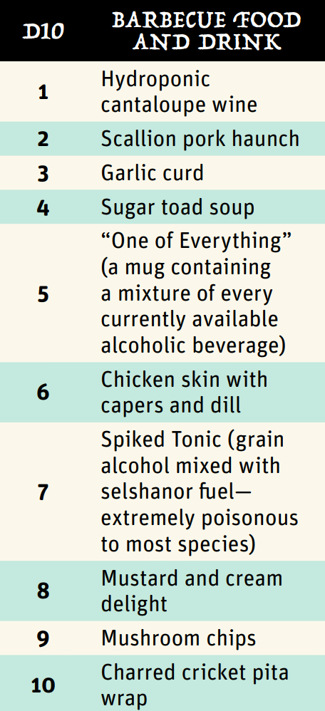 The point of a list or table might be to rattle off food options when the players enter a tavern, but what does that really add? On the flipside, considering how a city grows, catches, imports, or concocts its food is likely to have knock-off effects that inspire the rest of your worldbuilding.