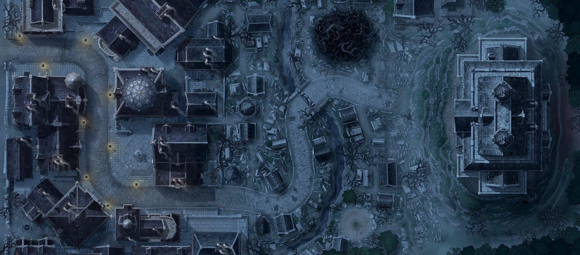 Because the goal of Sootwyn Barrow’s map is to facilitate running Sootwyn Barrow’s quest, we didn’t feel a need to depict the entirety of the city. Instead, our map is a slice of the accursed village that suggests a larger city beyond but mostly focuses on the relevant play-space for the adventure. As Larian decided for Baldur’s Gate 3, we decided it was a better use of resources to populate a slice of the city with maximal gameplay density rather than trying in vain to make a massive, lesser detailed city map.